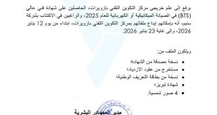أعلنت إدارة المصادر البشرية في الشركة الوطنية للصناعة والمناجم “سنيم” عن فتح باب الترشح للاكتتاب أمام خريجي مركز التكوين التقني بالزويرات. ودعت الشركة الراغبين في الاكتتاب فيها، والحاصلين على شهادة فني عالي BTS في الصيانة الميكانيكية والكهربائية لعام 2025 م لتقديم ملفاتهم. وحددت الشركة الفترة من 12 إلى 23 يناير 2026 م لتقديم ملفاتهم بمركز التكوين التقني في الزويرات. فيما …
