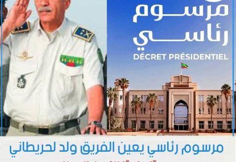 نواكشوط -شبكة المراقب الإخبارية أعلنت رئاسة الجمهورية أنه، بموجب مرسوم صادر اليوم، تم تعيين الفريق محمد محمد سالم لحريطاني مديرا عاما للأمن الوطني