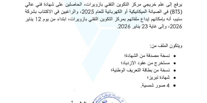 ودعت الشركة الراغبين في الاكتتاب فيها، والحاصلين على شهادة فني عالي BTS في الصيانة الميكانيكية والكهربائية لعام 2025 م لتقديم ملفاتهم.